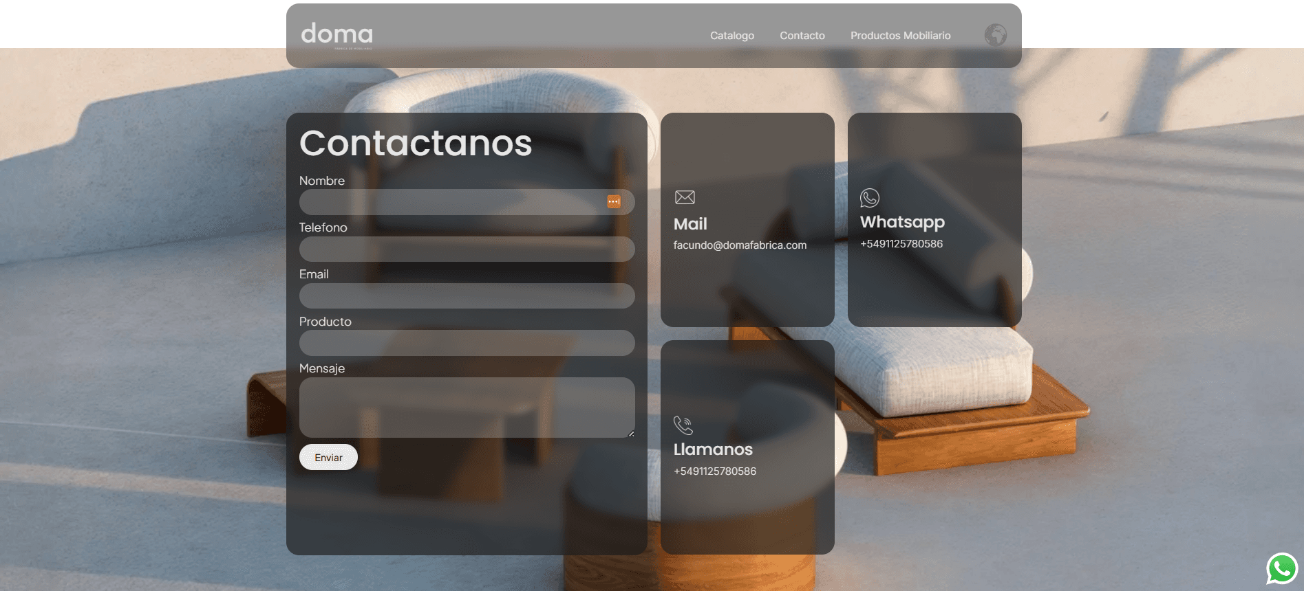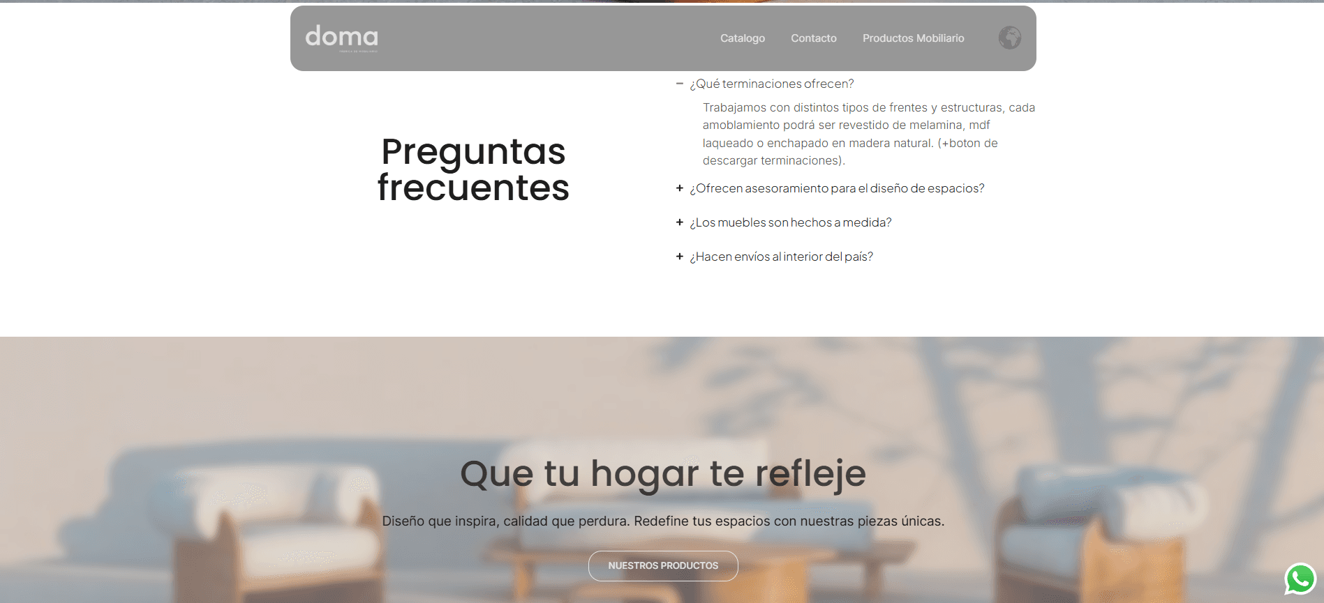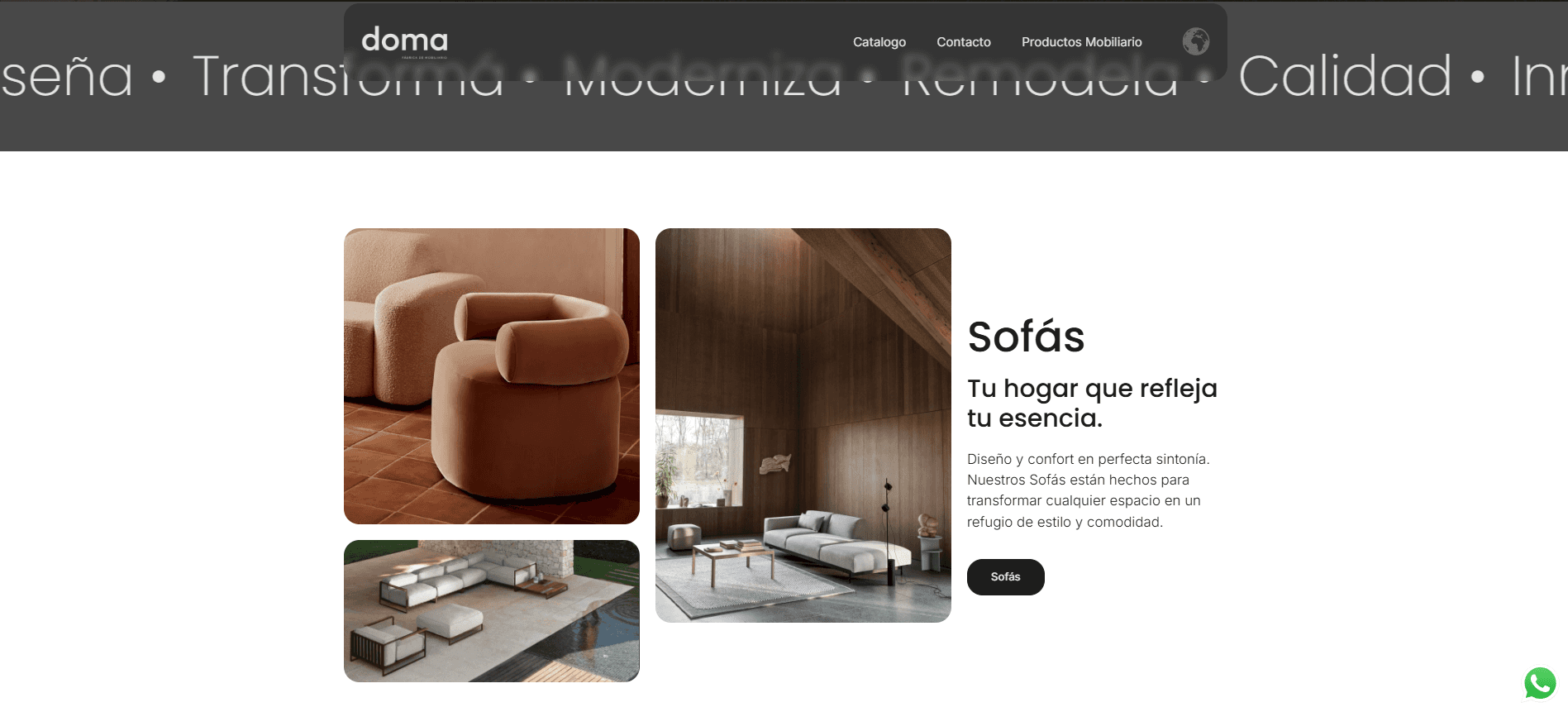 Diseñé y desarrollé el sitio web de Doma Mobiliario, una marca de muebles contemporáneos donde la funcionalidad y el diseño se integran en cada pieza. El objetivo del proyecto fue transmitir una identidad visual elegante y equilibrada, resaltando el carácter inspirador de sus productos y su capacidad para destacarse y convivir armónicamente en distintos espacios.